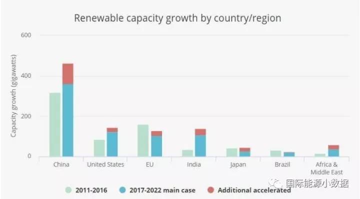 過去對(duì)于可再生能源發(fā)展規(guī)模預(yù)測(cè)曾經(jīng)偏保守的IEA現(xiàn)在預(yù)測(cè),2017-2022年間全球可再生能源新增裝機(jī)將至少達(dá)到920吉瓦(其中風(fēng)電321吉瓦、光伏438吉瓦),其中363吉瓦(39%)將來自中國(guó)。如果各國(guó)政策支持力度加大的樂觀情形下,2017-2022年間可再生能源新增裝機(jī)可能達(dá)到1150吉瓦,其中464吉瓦(40%)來自中國(guó)。