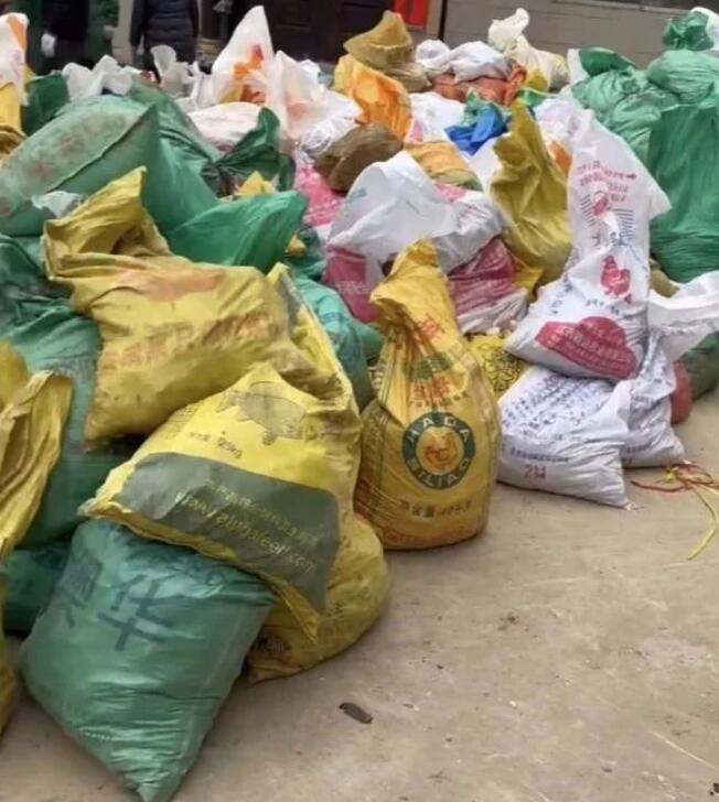 村民挖來(lái)的鋰礦石裝進(jìn)飼料袋,堆在村莊空地上。受訪者供圖