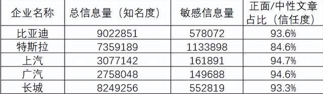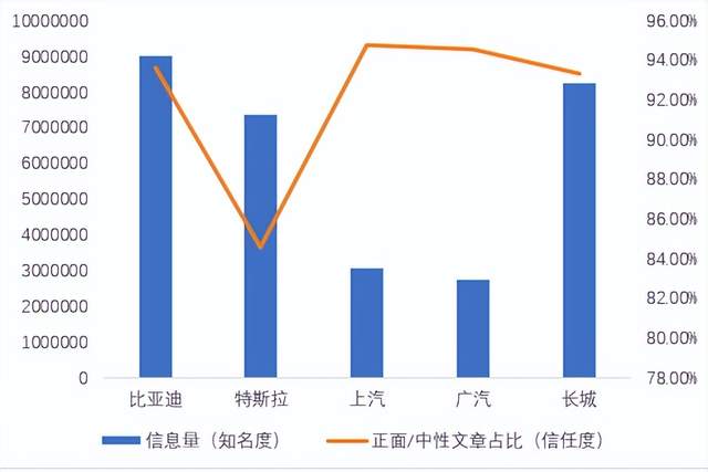 根據(jù)人民數(shù)據(jù)資產(chǎn)服務(wù)平臺(tái)數(shù)據(jù)顯示,截至2023年9月底,比亞迪、特斯拉、上汽、廣汽、長(zhǎng)城的總信息量(知名度)和正面/中性文章占比(信任度)呈現(xiàn)出一定的特點(diǎn)。