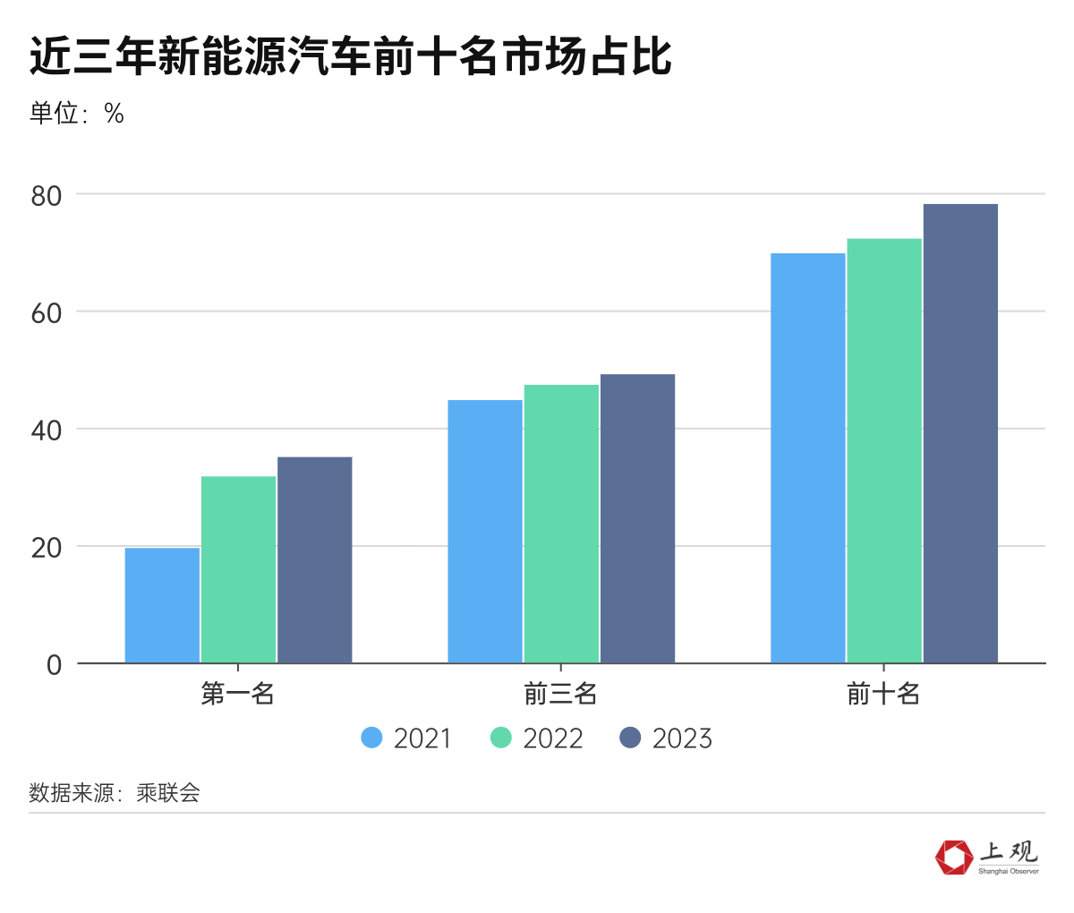 目前來看,誰贏還真說不定,但尾部企業(yè)肯定日子更難。政府補貼退坡后,新能源汽車銷量本來就越來越集中在頭部企業(yè)。最近三年,前十名的市場占比增加了約10%,接近80%。銷量第一名的比亞迪,所占的市場份額達(dá)到35%。而在2021年,這一占比僅為19.5%。