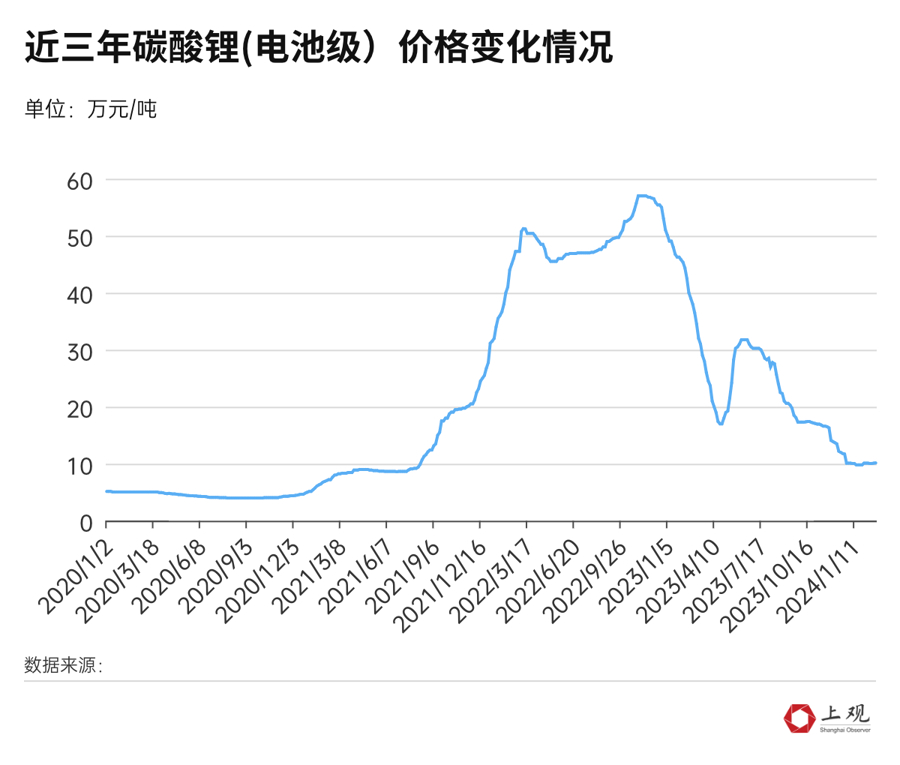 國產(chǎn)電池級碳酸鋰的價格,在2022年底到達(dá)峰值后,便開始滑坡式下降,相比峰值接近60萬元/噸的價格,目前已降至10.15萬元/噸,降幅達(dá)到82.2%。