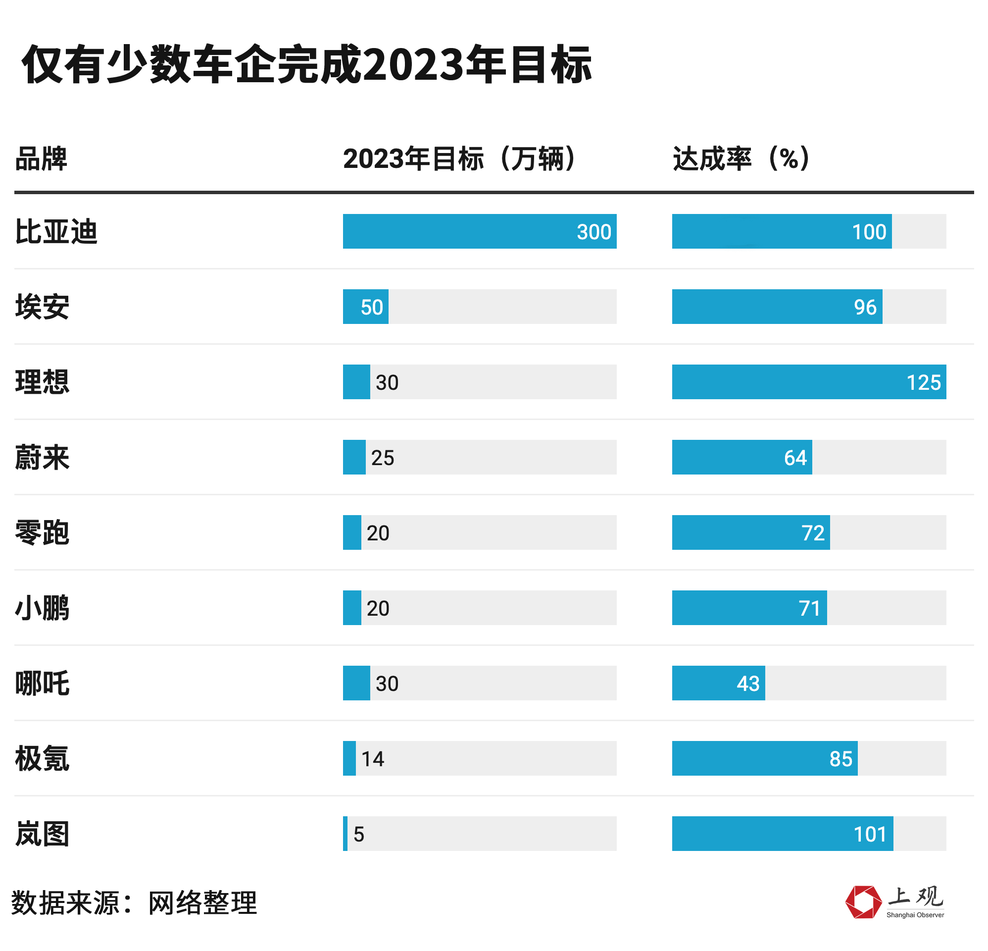 以此估算,2023年新能源汽車的產(chǎn)能利用率僅在57.47%。一般而言,產(chǎn)能正常的標(biāo)準(zhǔn)為79%至83%,低于79%,為產(chǎn)能過剩。也就可以理解,為何2023年大多數(shù)車企的銷量遠(yuǎn)不及預(yù)期。根據(jù)各企業(yè)的公告,2023年,僅有少數(shù)品牌如比亞迪、理想達(dá)到銷售目標(biāo)。