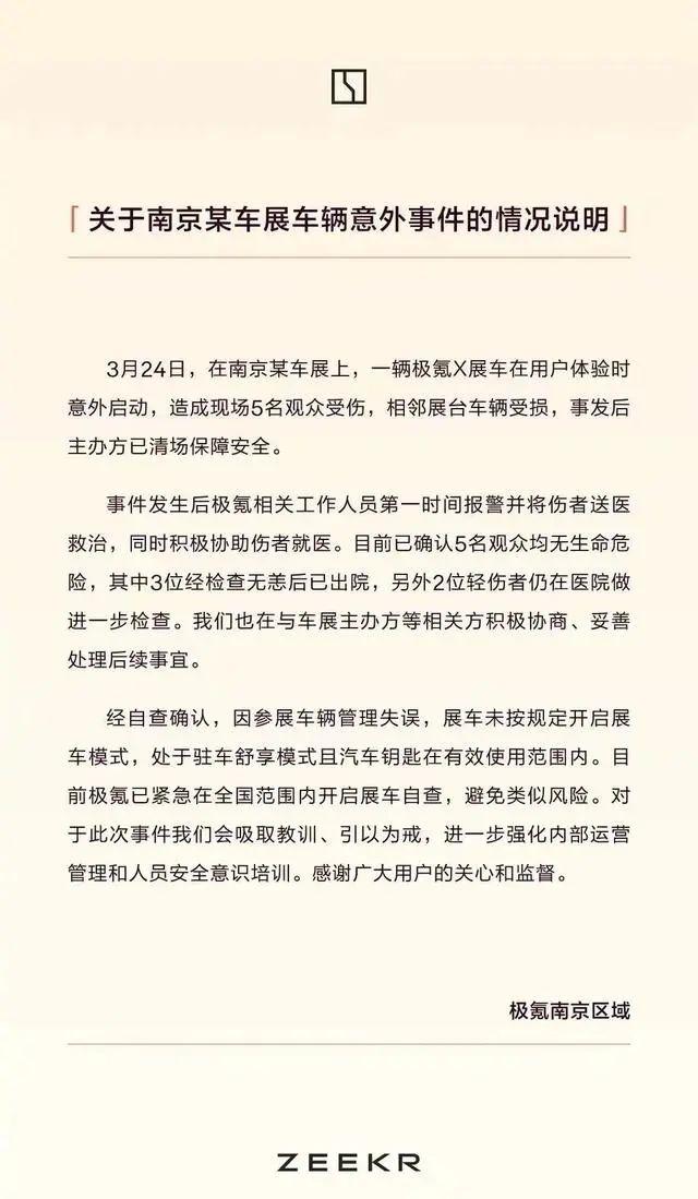 針對(duì)此次意外事件,極氪官方微博@極氪ZEEKR 于3月24日22時(shí)09分發(fā)布《關(guān)于南京某車(chē)展車(chē)輛意外事件的情況說(shuō)明》。