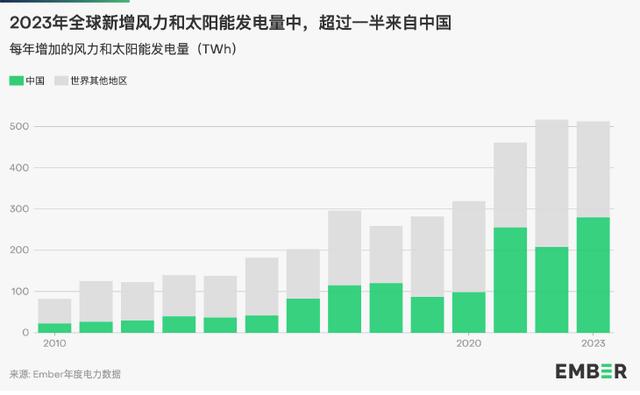 報(bào)告重點(diǎn)分析了中國(guó)的情況:中國(guó)在推進(jìn)全球能源轉(zhuǎn)型中扮演著舉足輕重的角色。中國(guó)是風(fēng)力和太陽能發(fā)電的全球領(lǐng)導(dǎo)者,擁有十多年來最大的絕對(duì)發(fā)電量和最高的年增加量。其以極快的速度增加風(fēng)力和太陽能發(fā)電量,改變?nèi)蜃畲蟮碾娏ο到y(tǒng)。僅2023年,中國(guó)就貢獻(xiàn)了全球一半以上的新增風(fēng)能和太陽能發(fā)電量,占全球太陽能和風(fēng)能發(fā)電量的37%。