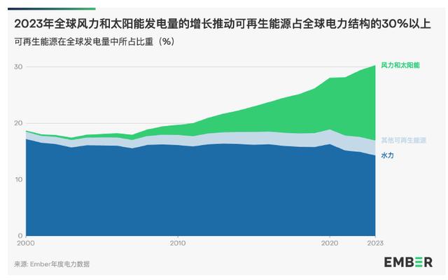 5月8日,根據(jù)全球能源智庫Ember的最新報(bào)告:2023 年,得益于太陽能和風(fēng)力發(fā)電量的增長(zhǎng),可再生能源發(fā)電量在全球發(fā)電量中的占比達(dá)到了前所未有的30%。2023年或?qū)⒊蔀殡娏π袠I(yè)碳排放量達(dá)到峰值的標(biāo)志性轉(zhuǎn)折點(diǎn)。