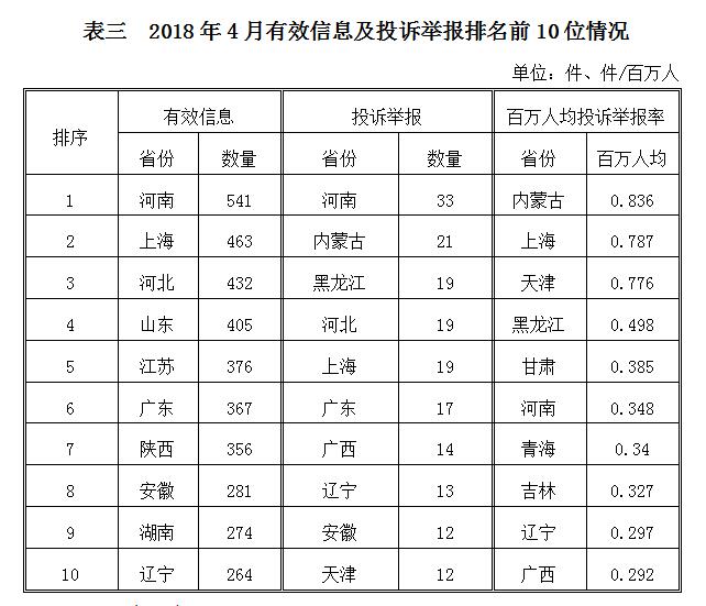 2018年4月,各?。ㄗ灾螀^(qū)、直轄市)按照有效信息數(shù)量排序,河南、上海、河北等?。ㄊ校┝腥珖?0位;按照投訴舉報數(shù)量排序,河南、內(nèi)蒙古、黑龍江等?。ㄗ灾螀^(qū))排在全國前10位;按照百萬人均投訴舉報率排序,內(nèi)蒙古、上海、天津等?。ㄊ?、自治區(qū))位于全國前10位。(2018年4月有效信息及投訴舉報排名前10位情況見表三)