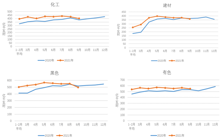 1-9月,化工行業(yè)用電量3740億千瓦時(shí),同比增長8.9%,增速比上年同期提高9.5個(gè)百分點(diǎn);建材行業(yè)用電量3084億千瓦時(shí),同比增長12.3%,增速比上年同期提高11.4個(gè)百分點(diǎn);黑色金屬冶煉行業(yè)用電量4800億千瓦時(shí),同比增長10.6%,增速比上年同期提高8.3個(gè)百分點(diǎn);有色金屬冶煉行業(yè)用電量4996億千瓦時(shí),同比增長7.3%,增速比上年同期提高3.9個(gè)百分點(diǎn)。