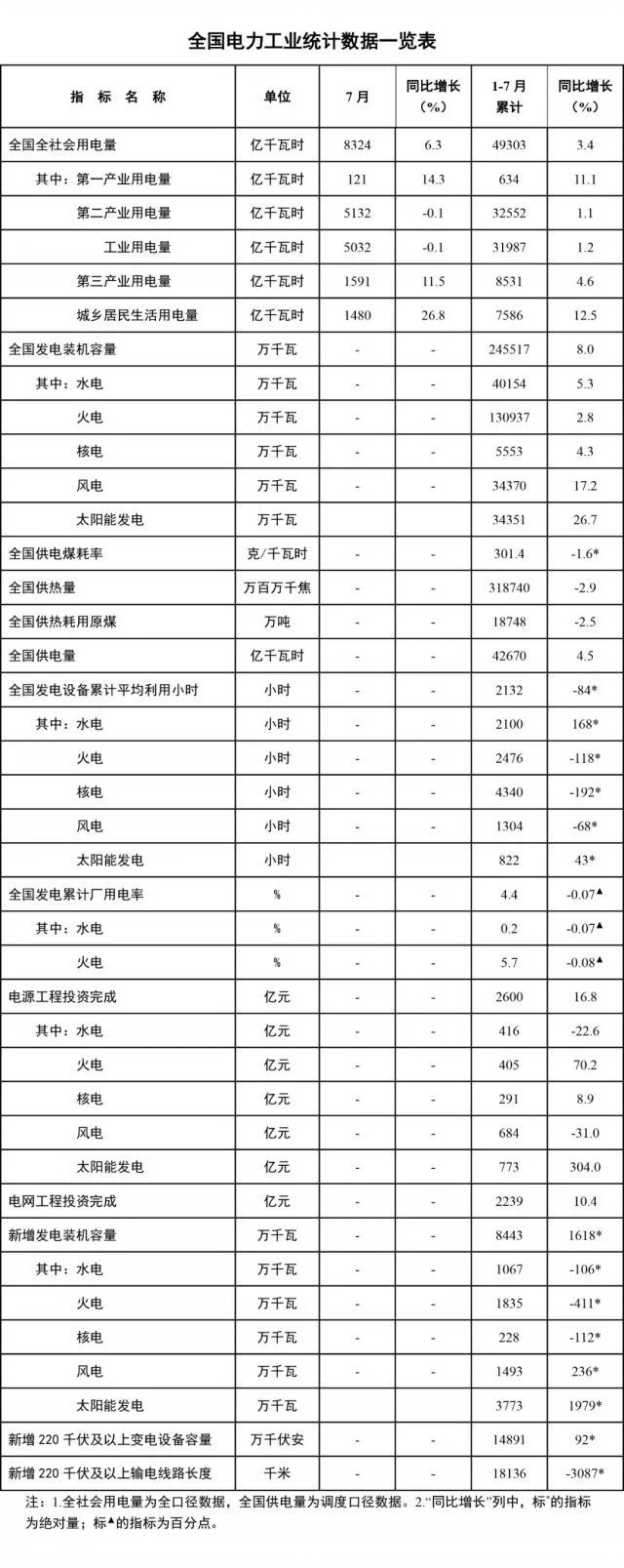 本網(wǎng)訊 8月19日,國(guó)家能源局發(fā)布1-7月份全國(guó)電力工業(yè)統(tǒng)計(jì)數(shù)據(jù)。截至7月底,全國(guó)發(fā)電裝機(jī)容量約24.6億千瓦,同比增長(zhǎng)8.0%。其中,風(fēng)電裝機(jī)容量約3.4億千瓦,同比增長(zhǎng)17.2%;太陽能發(fā)電裝機(jī)容量約3.4億千瓦,同比增長(zhǎng)26.7%。