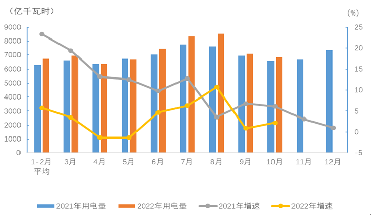 1-10月,化工行業(yè)用電量4523億千瓦時,同比增長5.3%;建材行業(yè)用電量3332億千瓦時,同比下降3.2%;黑色金屬冶煉行業(yè)用電量5087億千瓦時,同比下降4.9%;有色金屬冶煉行業(yè)用電量6182億千瓦時,同比增長2.9%。