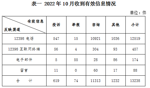2022年10月,國家能源局12398能源監(jiān)管熱線(以下簡(jiǎn)稱12398熱線)共收到有效信息13238件(包含投訴、舉報(bào)、咨詢和其他訴求類別),環(huán)比減少6.23%,同比增加24.69%。(2022年10月收到有效信息情況見表一)