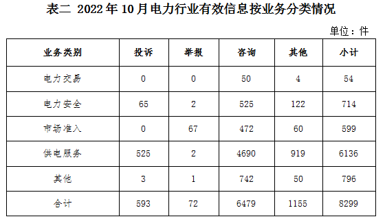 電力行業(yè)排在首位,有效信息數(shù)量為8299件,占全部有效信息的62.69%。群眾關(guān)注的內(nèi)容主要集中在供電服務(wù)、電力安全、市場(chǎng)準(zhǔn)入等方面。(2022年10月電力行業(yè)有效信息按業(yè)務(wù)分類情況見表二)