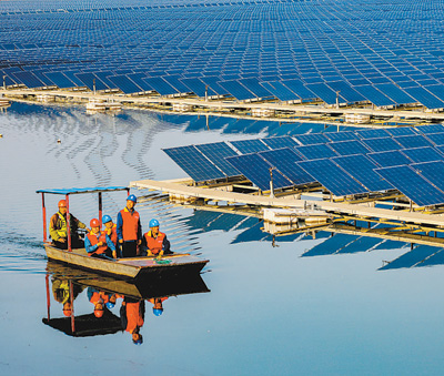 安徽淮北,電力工人在駕船巡檢“漁光互補”光伏發(fā)電站的設備。