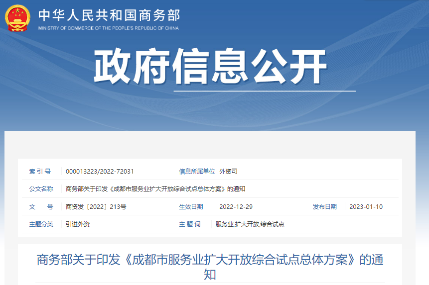 商務(wù)部關(guān)于印發(fā)《成都市服務(wù)業(yè)擴(kuò)大開(kāi)放綜合試點(diǎn)總體方案》的通知