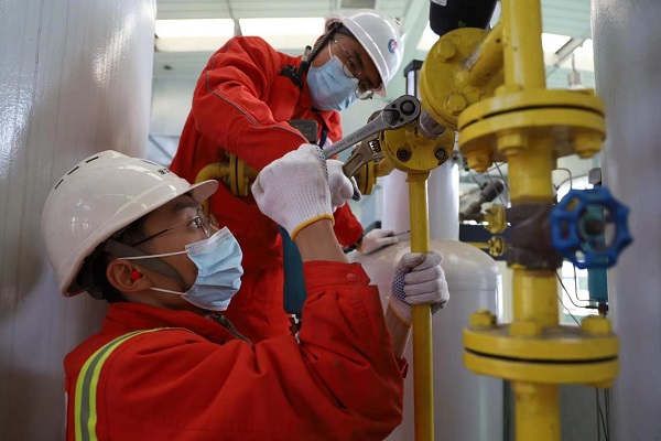 邢偵虎對站內(nèi)天然氣管道進行安全檢查。