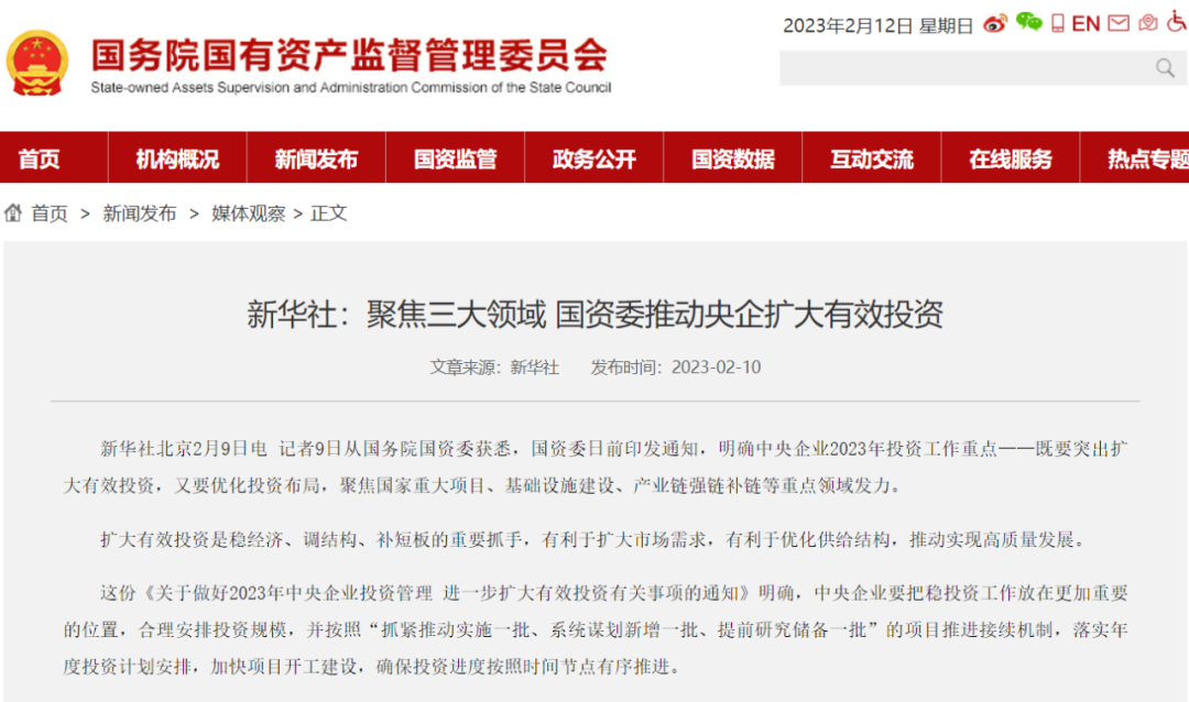 日前,國(guó)務(wù)院國(guó)資委印發(fā)《關(guān)于做好2023年中央企業(yè)投資管理 進(jìn)一步擴(kuò)大有效投資有關(guān)事項(xiàng)的通知》(以下簡(jiǎn)稱《通知》),明確中央企業(yè)2023年投資工作三大重點(diǎn)領(lǐng)域:國(guó)家重大項(xiàng)目、基礎(chǔ)設(shè)施建設(shè)、產(chǎn)業(yè)鏈強(qiáng)鏈補(bǔ)鏈。