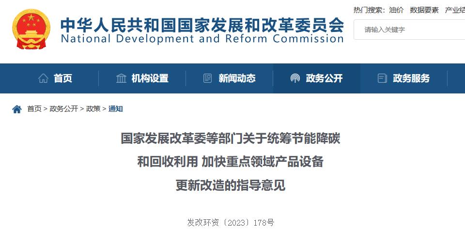 國家發(fā)展改革委等部門關(guān)于統(tǒng)籌節(jié)能降碳和回收利用 加快重點領(lǐng)域產(chǎn)品設(shè)備更新改造的指導(dǎo)意見