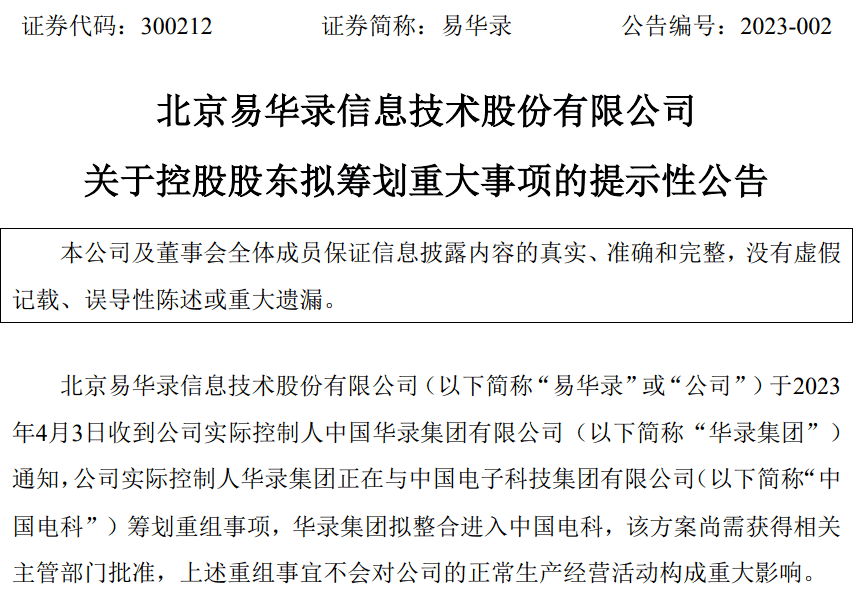 4月3日,北京易華錄信息技術(shù)股份有限公司發(fā)布公告稱,收到公司實際控制人中國華錄集團有限公司(以下簡稱“華錄集團”)通知,華錄集團正在與中國電子科技集團有限公司(以下簡稱“中國電科”)籌劃重組事項,華錄集團擬整合進入中國電科。易華錄表示,該方案尚需獲得相關(guān)主管部門批準(zhǔn),上述重組事宜不會對公司的正常生產(chǎn)經(jīng)營活動構(gòu)成重大影響。公司將按照法律法規(guī)的要求及時披露進展情況。