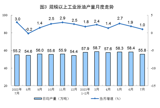 原油產(chǎn)量小幅增加,進口保持較快增長。7月份,生產(chǎn)原油1731萬噸,同比增長1.0%,增速比6月份放緩0.9個百分點,日均產(chǎn)量55.8萬噸。進口原油4369萬噸,同比增長17.0%,增速比6月份回落28.4個百分點。
