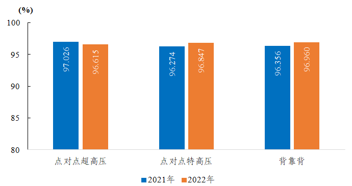 2022年,納入電力可靠性統(tǒng)計(jì)的點(diǎn)對(duì)點(diǎn)超高壓直流輸電系統(tǒng)能量可用率為96.615%,同比下降0.411個(gè)百分點(diǎn);點(diǎn)對(duì)點(diǎn)特高壓直流輸電系統(tǒng)能量可用率為96.847%,同比上升0.573個(gè)百分點(diǎn);背靠背直流輸電系統(tǒng)能量可用率為96.960%,同比上升0.604個(gè)百分點(diǎn)。