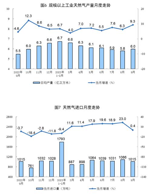 天然氣生產(chǎn)增速加快,進(jìn)口保持平穩(wěn)。9月份,生產(chǎn)天然氣179億立方米,同比增長9.3%,增速比8月份加快3.0個百分點(diǎn),日均產(chǎn)量6.0億立方米。進(jìn)口天然氣1015萬噸,同比增長0.4%,增速比8月份回落22.6個百分點(diǎn)。