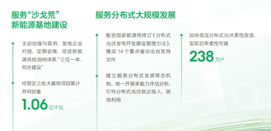 促進(jìn)新能源高質(zhì)量發(fā)展,經(jīng)營(yíng)區(qū)三批大基地項(xiàng)目累計(jì)并網(wǎng)容量1.06億千瓦;加快低壓分布式光伏柔性改造,實(shí)現(xiàn)功率柔性可調(diào)238萬(wàn)戶;全年風(fēng)光新能源裝機(jī)容量新增2.7億千瓦,同比增長(zhǎng)16.5%;風(fēng)光新能源發(fā)電量占比19.3%,利用率96.1%;開工抽水蓄能電站5座,建成投運(yùn)抽水蓄能機(jī)組23臺(tái),在運(yùn)裝機(jī)容量累計(jì)達(dá)到4056萬(wàn)千瓦;經(jīng)營(yíng)區(qū)新型儲(chǔ)能達(dá)到5876萬(wàn)千瓦。