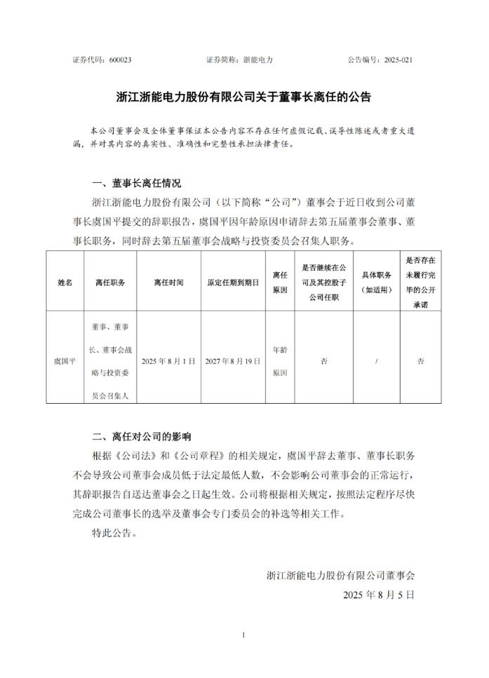 虞國(guó)平同時(shí)辭去第五屆董事會(huì)戰(zhàn)略與投資委員會(huì)召集人職務(wù),離任后不再在公司及其控股子公司任職。