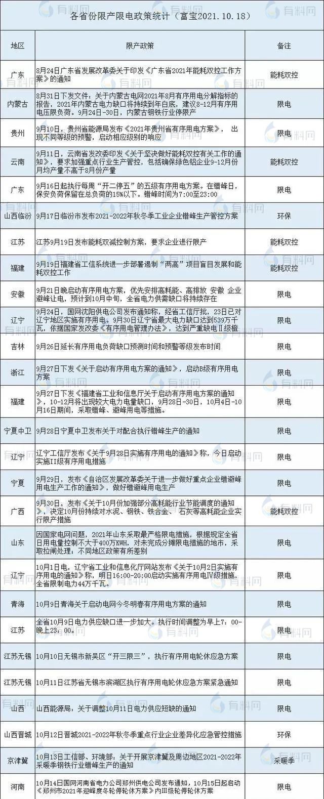 各省份限產(chǎn)限電的政策統(tǒng)計