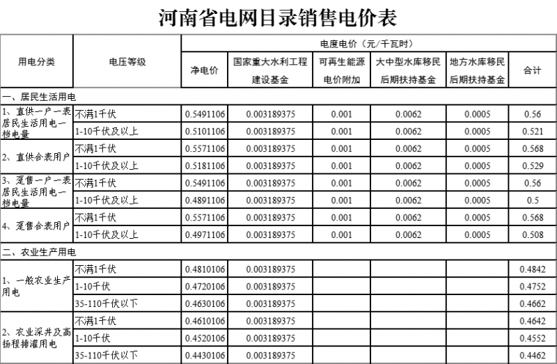 二、自2021年10月15日起,全面取消工商業(yè)目錄銷售電價,僅保留居民生活、農(nóng)業(yè)生產(chǎn)目錄銷售電價,調(diào)整后的河南省電網(wǎng)目錄銷售電價見附件1。執(zhí)行兩部制電價的工商業(yè)用戶,基本電價仍按國家現(xiàn)行有關(guān)規(guī)定執(zhí)行。