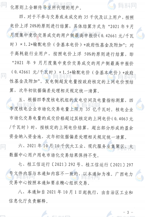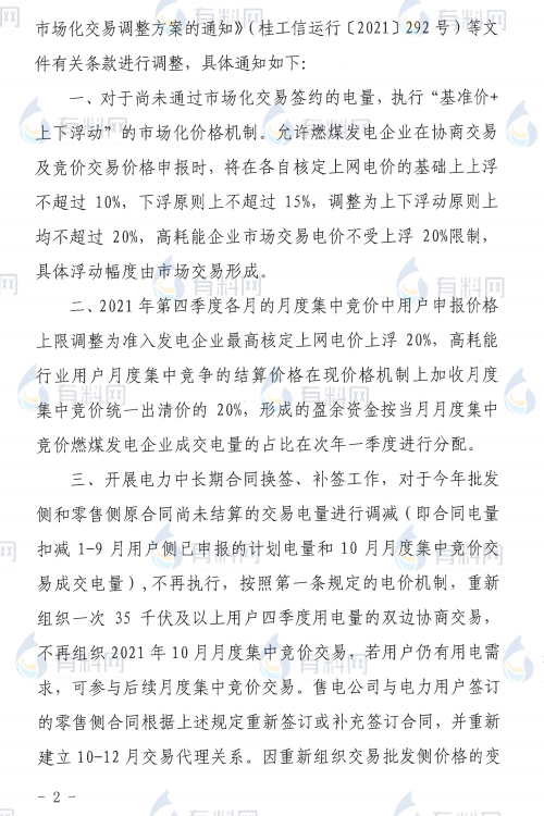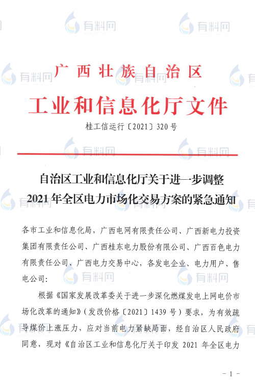 廣西發(fā)布《自治區(qū)工業(yè)和信息化廳關(guān)于進一步調(diào)整2021年全區(qū)電力市場化交易方案的緊急通知》,在緊急通知中,高耗能企業(yè)電價直接上浮50%進行結(jié)算。