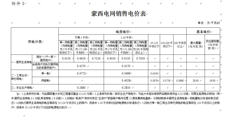 內(nèi)蒙古發(fā)改委提出《關(guān)于明確蒙西地區(qū)電力市場交易用戶保底電價的通知》中的保底電價比原有電價上浮了80%。蒙西的新保底電價如下表所示