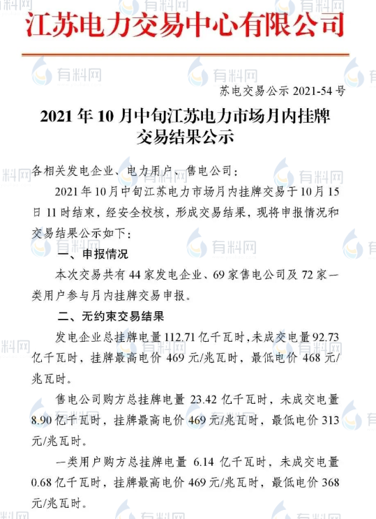 江蘇組織開展了10月中旬月內(nèi)掛牌交易,共成交電量19.98億千瓦時,成交均價468.97元/兆瓦時,成交價較基準(zhǔn)價上浮了19.94%。