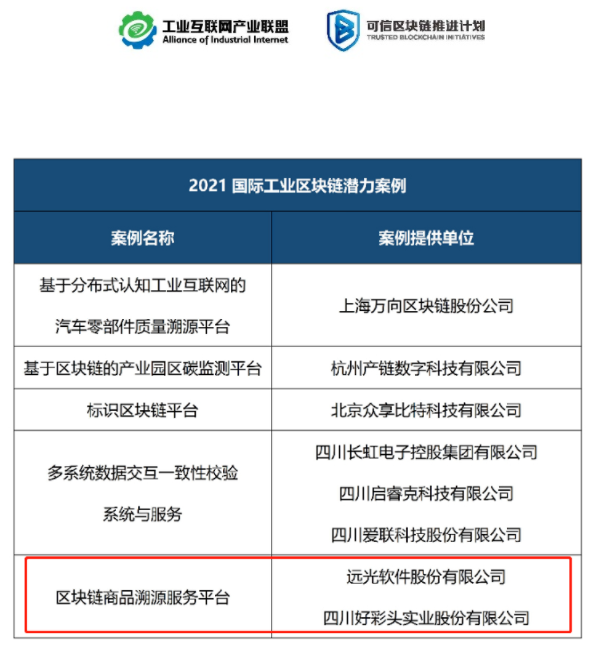 近日,由湖南省工業(yè)和信息化廳主辦的2021國際工業(yè)區(qū)塊鏈大會在長沙順利召開,會上發(fā)布了《2021工業(yè)區(qū)塊鏈案例集》、《工業(yè)區(qū)塊鏈應(yīng)用指南》、《2021工業(yè)區(qū)塊鏈技術(shù)應(yīng)用及趨勢報告》等重磅成果。憑借在區(qū)塊鏈領(lǐng)域的創(chuàng)新技術(shù)能力及應(yīng)用成果,遠光軟件區(qū)塊鏈商品溯源服務(wù)平臺成功入選《2021工業(yè)區(qū)塊鏈案例集》。