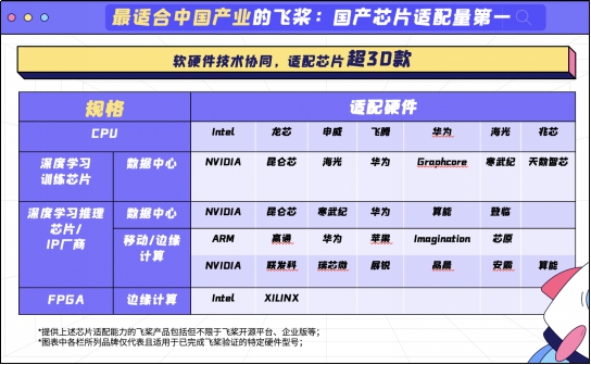 以百度飛槳為例,經(jīng)過對大量真實生產(chǎn)場景的反復(fù)打磨,已經(jīng)能夠使傳統(tǒng)企業(yè)在智能化轉(zhuǎn)型中實現(xiàn)高性能開發(fā)、大規(guī)模訓(xùn)練、不同場景和不同軟硬件平臺敏捷部署。更重要的是,飛槳已經(jīng)和包括百度昆侖芯、華為昇騰、英特爾、英偉達(dá)在內(nèi)的22家國內(nèi)外硬件廠商,完成了31種芯片的適配和優(yōu)化,覆蓋全部國內(nèi)外主流芯片,最大程度幫助企業(yè)降本增效。