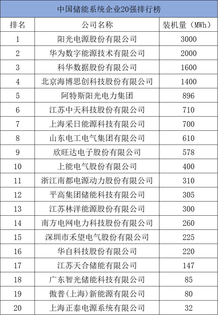 陽(yáng)光電源股份有限公司以銷量3000MWh的成績(jī)依舊穩(wěn)居第一,華為數(shù)字能源技術(shù)有限公司和科華數(shù)據(jù)股份有限公司位居第二和第三。