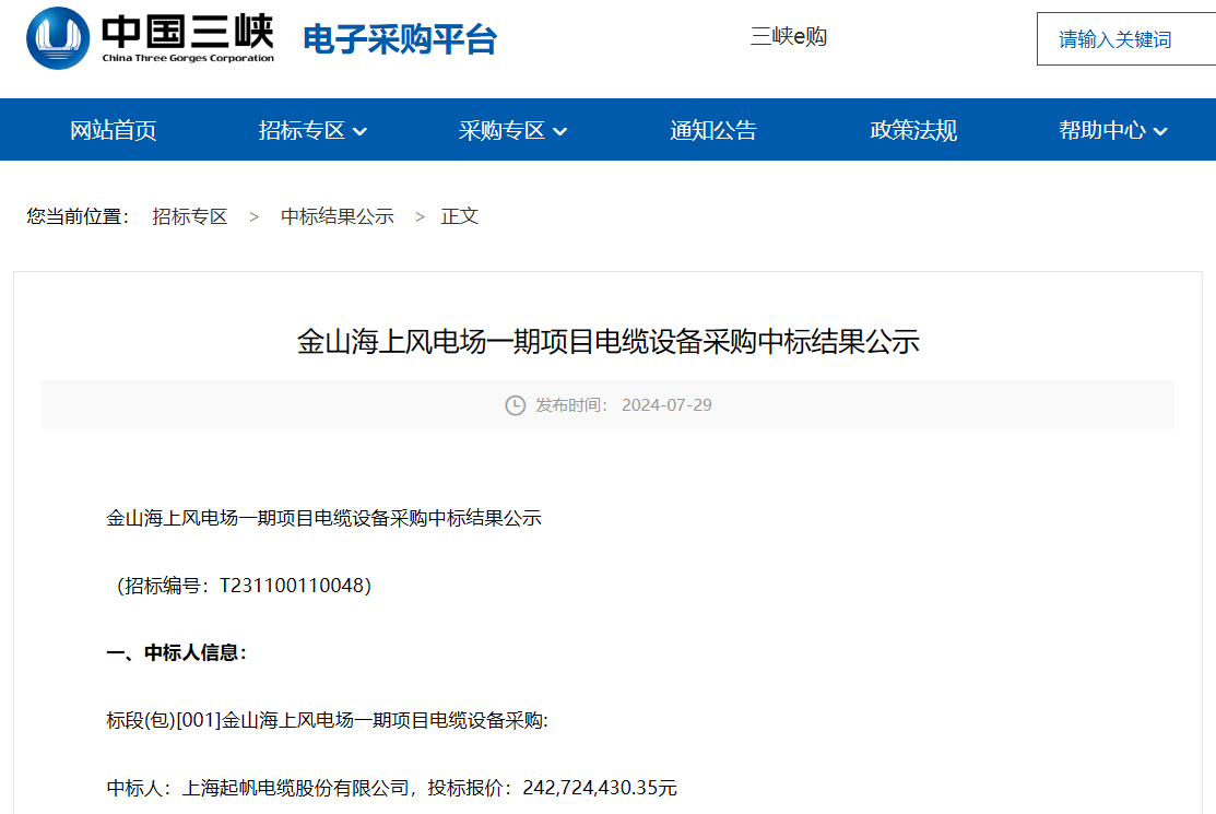 2024年7月29日,中國三峽電子采購平臺發(fā)布《金山海上風(fēng)電場一期項目電纜設(shè)備采購中標(biāo)結(jié)果公示》的公告。