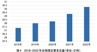 近五年來,全國煤炭消費總量隨著GDP增長同步逐年上升,2022年預(yù)計達到30.3億噸標(biāo)準(zhǔn)煤(見圖4)。