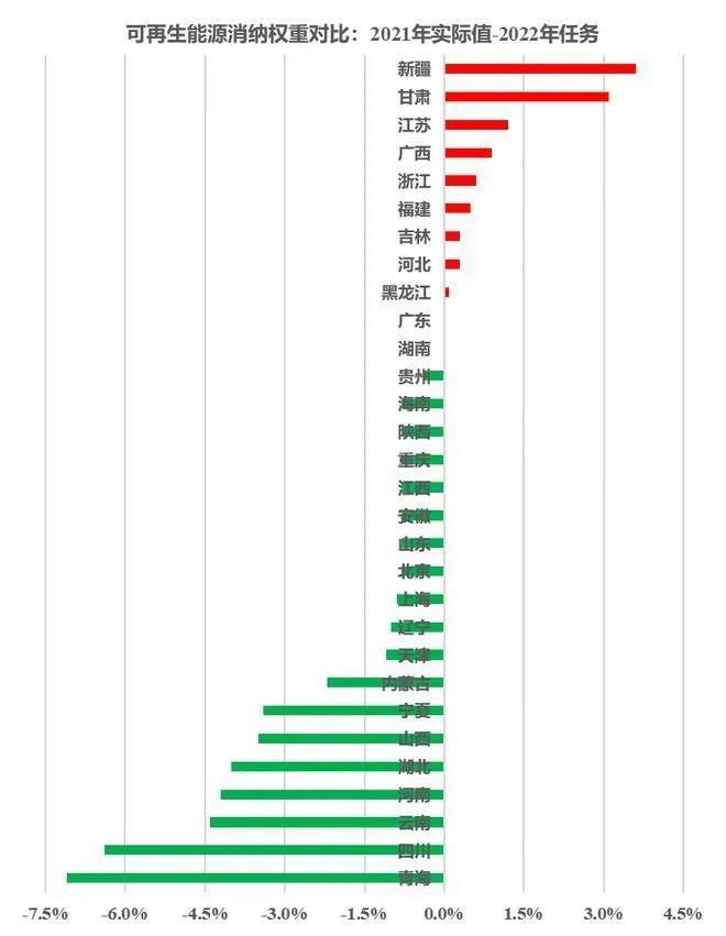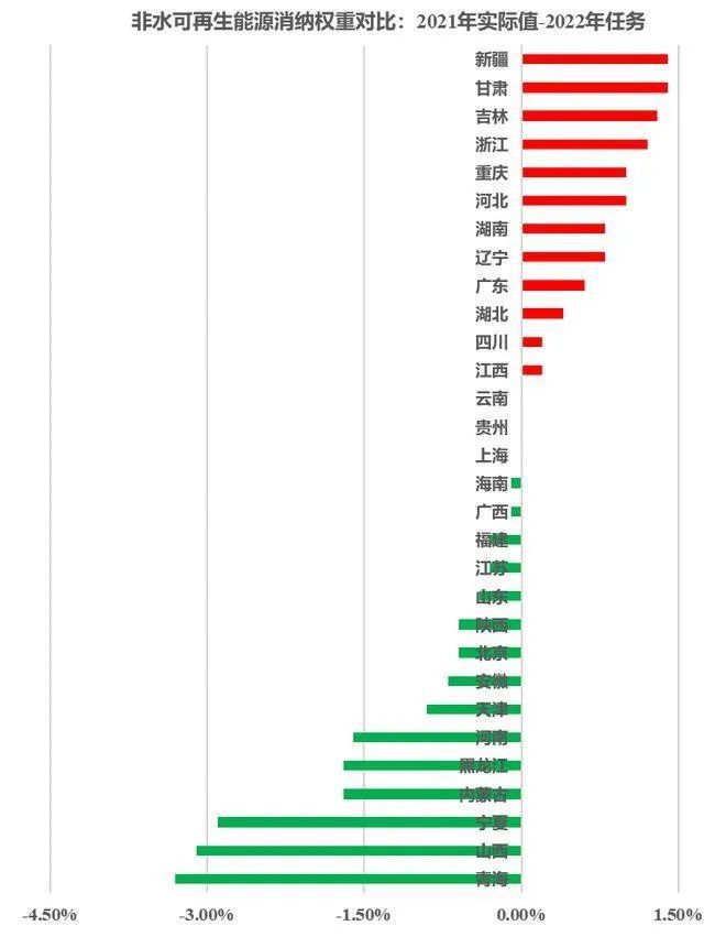 但從非水可再生能源消納權重對比看,2021年實際值和2022年的任務相比,新疆、甘肅、吉林、浙江、重慶、河北等地差距比較大,這些地方的風光等可再生能源需要大力發(fā)展。