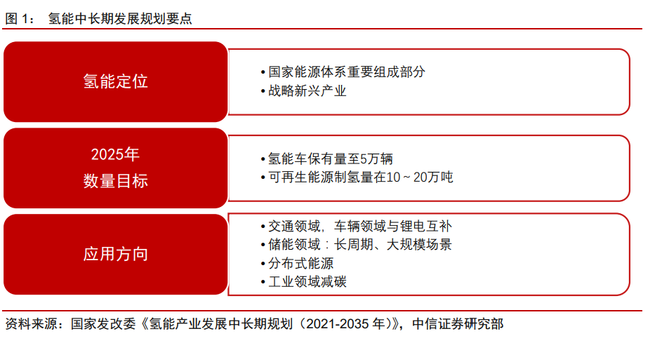 國(guó)家發(fā)改委2022年3月23日發(fā)布《氫能產(chǎn)業(yè)發(fā)展中長(zhǎng)期規(guī)劃(2021-2035)》(簡(jiǎn)稱(chēng)“行業(yè)中長(zhǎng)期規(guī)劃”),體現(xiàn)出政策對(duì)未來(lái)氫能產(chǎn)業(yè)的發(fā)展定位,也明確了政策鼓勵(lì)的應(yīng)用場(chǎng)景和領(lǐng)域,勾勒出氫能中長(zhǎng)期藍(lán)圖,有助于強(qiáng)化投資者對(duì)氫能產(chǎn)業(yè)發(fā)展信心,提振產(chǎn)業(yè)參與者的長(zhǎng)期預(yù)期。