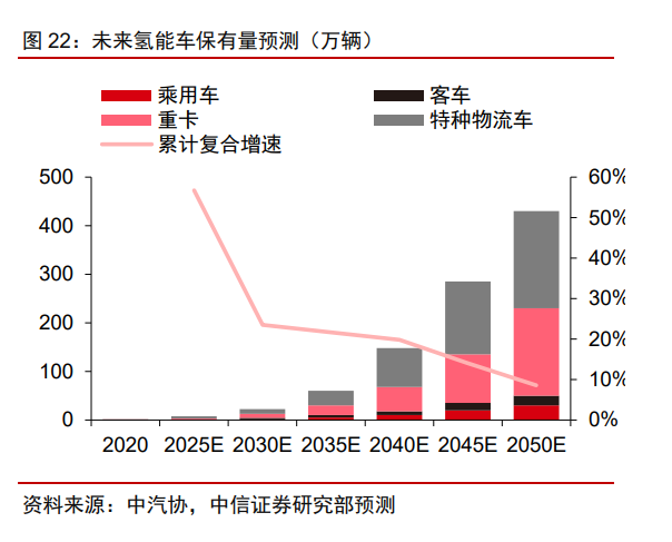 我們預(yù)計(jì),隨著國內(nèi)技術(shù)進(jìn)步以及規(guī)?;?yīng)的疊加,未來國內(nèi)氫能車成本或有持續(xù)的降本,目前氫能重卡的成本約140萬元/輛,預(yù)計(jì)2025年可以降至100萬元/輛,至2030年可降至80萬元/輛,基本可以實(shí)現(xiàn)與鋰電、柴油相應(yīng)車型的平價(jià)。