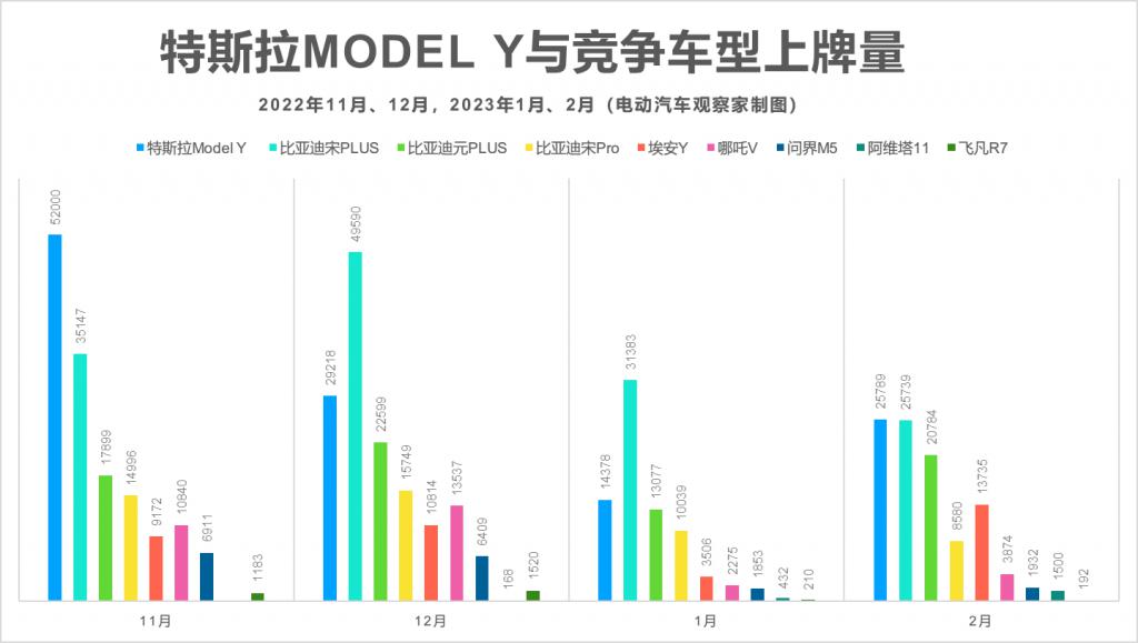 通過 1 月份 4 萬元左右的降幅,Model Y 在 2 月份開始回到 " 月銷 3 萬 " 的趨勢當(dāng)中,并對競爭對手產(chǎn)生了連鎖反應(yīng):