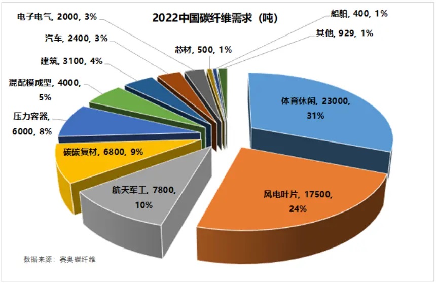 從應用領(lǐng)域看,中國碳纖維需求的大頭是體育休閑,主要是一些釣魚竿、羽毛球網(wǎng)球拍之類的,2.3萬噸,占到需求的31%;其次是風電葉片,1.75萬噸,占24%;再次航天軍工,這是碳纖維最早的應用領(lǐng)域,7800噸占10%。其他還有碳碳復材、壓力容器等。