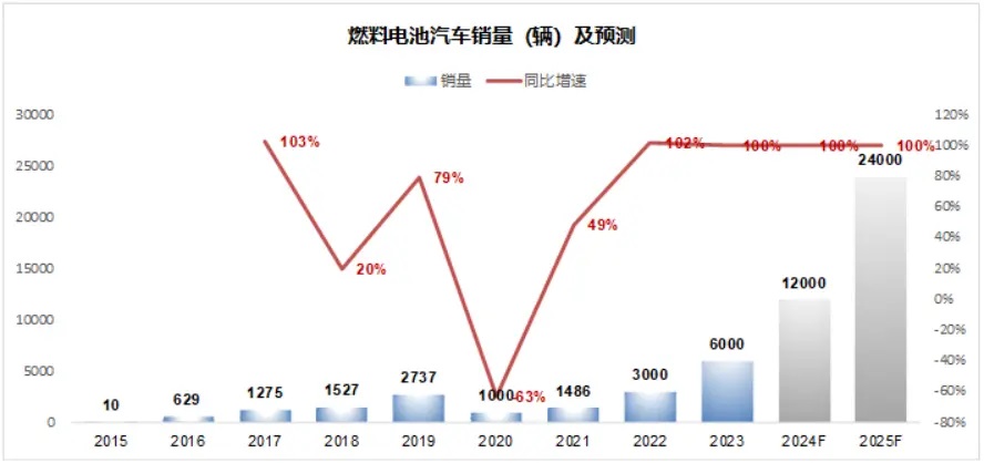 假如到2025年完成5萬輛的保有量,未來兩年需要燃料電池汽車銷量翻倍,2024年1.2萬輛,2025年2.4萬輛。市場上很多人質(zhì)疑這個目標是不是能完成。