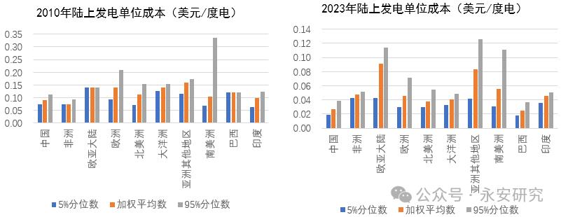 圖3、全球陸上與海上風力度電成本(美元/度電)