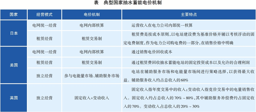 現(xiàn)階段,日本抽水蓄能電站主要采用租賃制(電源開發(fā)商參與)和內(nèi)部核算制(電力公司主導);美國則以電網(wǎng)統(tǒng)一運營模式為主(抽蓄電站約占70%),輔以租賃運營和少量獨立運營,直接參與電力市場的比例較低;英國抽水蓄能電站雖然總體規(guī)模有限,但其高度市場化的發(fā)電側(cè)環(huán)境使其能夠作為獨立成員參與市場,其收入明確區(qū)分為年度交易的固定收入與競價交易的變動收入兩部分,構(gòu)成典型的兩部制電價模式(見表)。