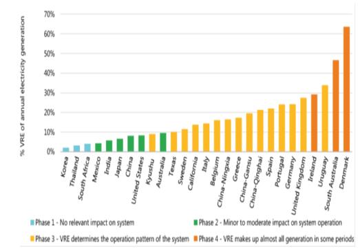 圖1 不同國(guó)家/地區(qū)波動(dòng)性可再生能源發(fā)電占比及相應(yīng)的系統(tǒng)集成階段(2018年)