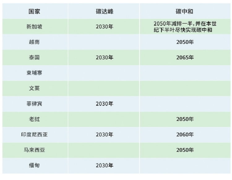 東盟各國碳達(dá)峰碳中和承諾時(shí)間表 (數(shù)據(jù)來源:各國自主貢獻(xiàn)目標(biāo)、中長期減排發(fā)展戰(zhàn)略)
