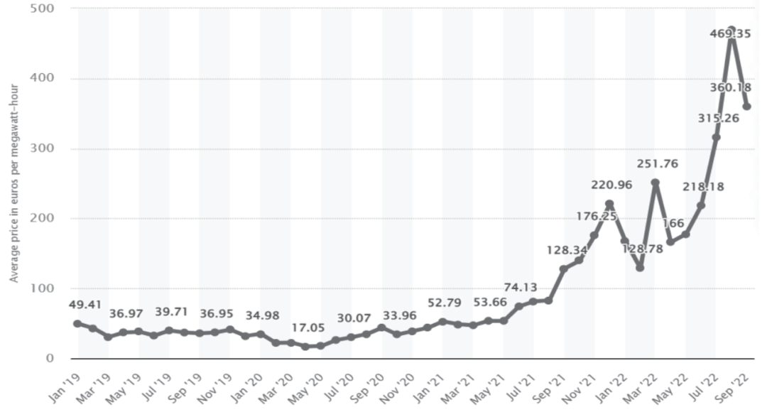 圖 2019—2022年德國電力批發(fā)價(jià)格月度走勢(單位:歐元/兆瓦時(shí))