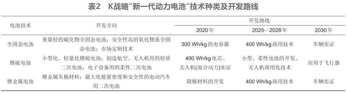 圍繞下一代動力電池技術(shù),韓國政府將拉動公私合作,支持大規(guī)模電池研發(fā)。K戰(zhàn)略中,韓國政府對研發(fā)路線進(jìn)行了規(guī)劃,主要圍繞新一代電池制造技術(shù)以及實現(xiàn)全固態(tài)電池、鋰硫電池、鋰金屬電池的商用化,如表2所示。