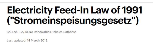 在此之前的1991年,德國已經(jīng)通過了《上網(wǎng)電價(jià)法(Stromeinspeisungsgesetz)》,推行可再生能源的補(bǔ)貼計(jì)劃。