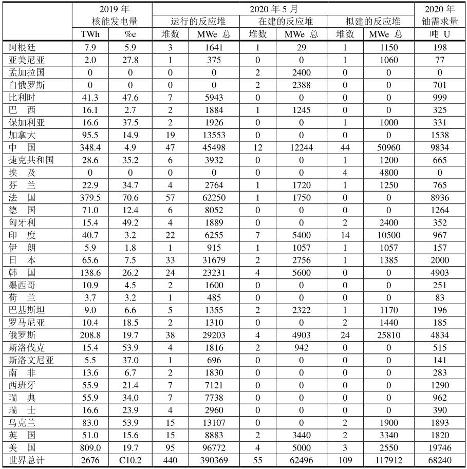 表中“%e”表示核能發(fā)電占發(fā)電總量的百分率。全球核能發(fā)電占全球發(fā)電總量的10.2%,其中法國(guó)高達(dá)70.6%。本數(shù)據(jù)是世界核能協(xié)會(huì)WNA 2020年5月份提供的數(shù)據(jù)。
